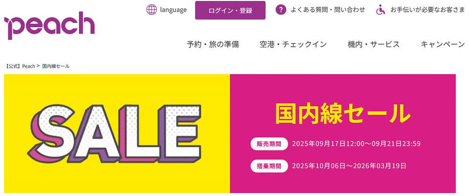 ピーチ(Paech Aviation)は、国内線セールはこのあと9月17日12時~21日23時59分に実施する。