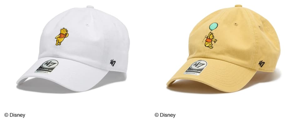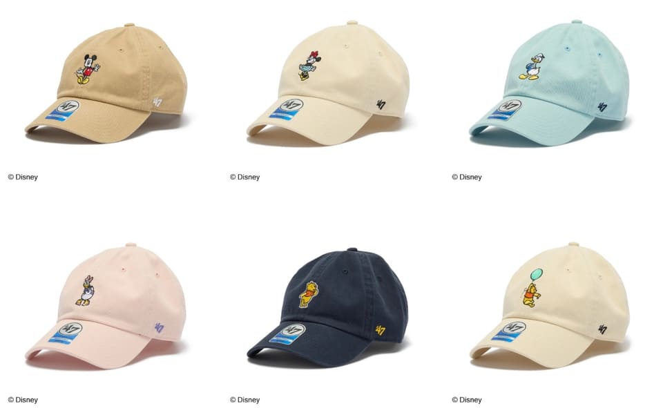 柔らかい成型の「'47 CLEAN UP」、縦幅のあるクラウンをもつ「MVP」からは、ミッキー&フレンズやプーさんの仲間たちをデザインしたモデルが登場。キッズサイズもリリースする。平らなバイザーが特徴の「HITCH」では、モノクロのミッキーを配したシックなモデルも用意した。
