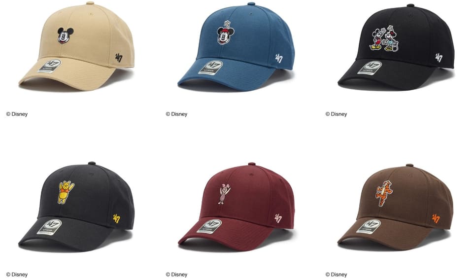 いずれも、フロントにミッキーマウスやプーさんなどのイラストが入ったシンプルなデザイン。ブラックからくすんだピンク系まで、キャラクターごとさまざまな色合いをラインアップする。一部のモデルでは、向かって右側にある「'47」のロゴにキャラクターのカラーをあしらっている。
