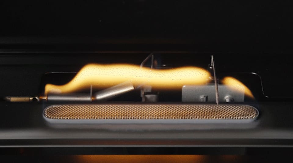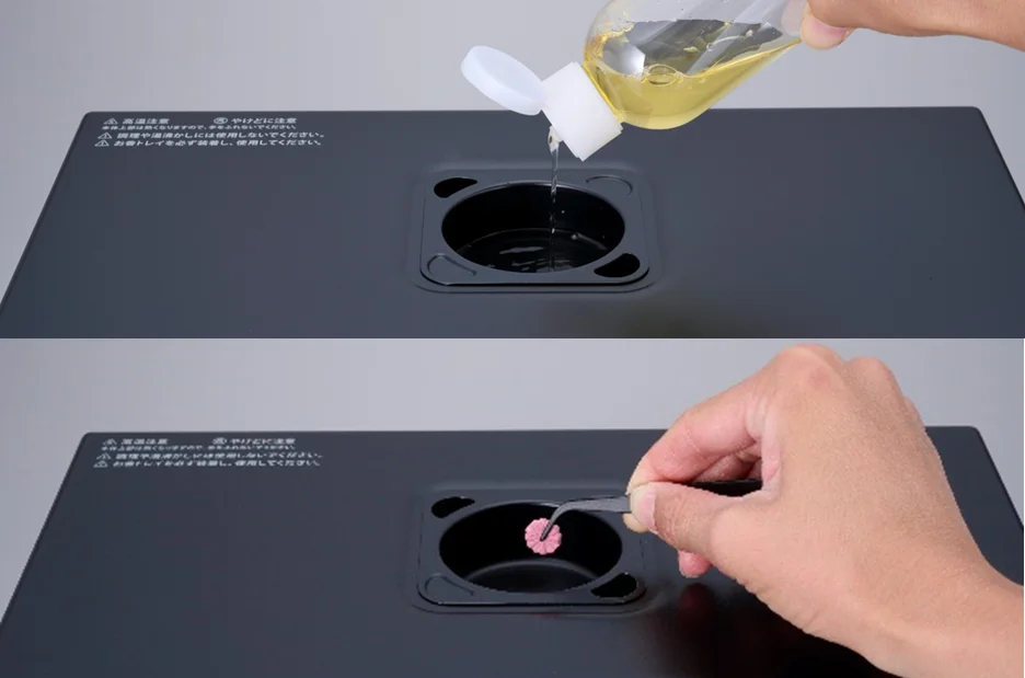 炎の鑑賞に重点を置いたインテリア暖炉で、焚き火をイメージした火のゆらめきがポイント。カセット1本で約7時間使用できる。天板のポットにアロマウォーターや香料を入れれば、香りを楽しむことも可能。