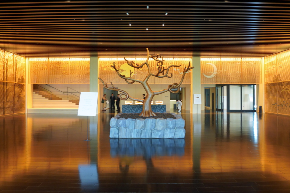 新たなメインロビーには、日本庭園と向き合うように組子アート「光風庭伝(こうふうていでん)」やシンボルツリーを配置。装飾は季節やイベントごとに変わるという。