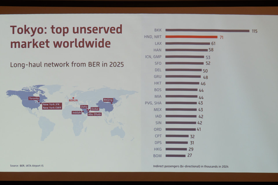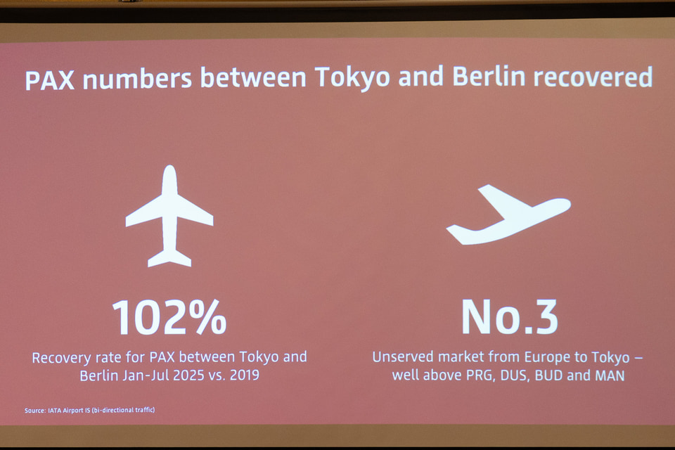 ベルリン・ブランデンブルク空港からは、直行便のない地域からのアクセスでは東京(羽田・成田)が世界第2位と大きな市場であることが述べられたほか、2025年1月~6月の渡航者数は、すでに2019年と比較しても102%まで回復済みであると説明した。