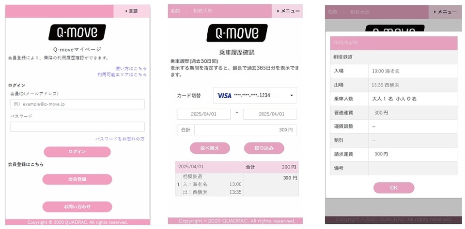 交通事業者向け決済およびプラットフォームを提供するQUADRACのWebサイトにアクセスし会員登録手続きをすると、タッチ決済の利用履歴を確認できる。