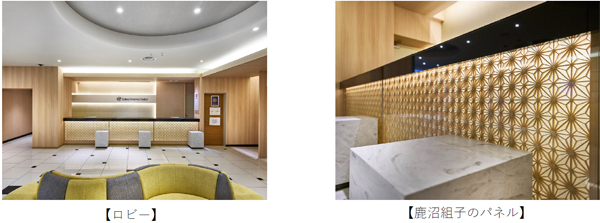 共有部では、ロビーや各階廊下、エレベーターホールを全面リニューアル。フロントのカウンター下には栃木の伝統工芸品「鹿沼組子」をあしらい、明るく温かみのある空間にした。