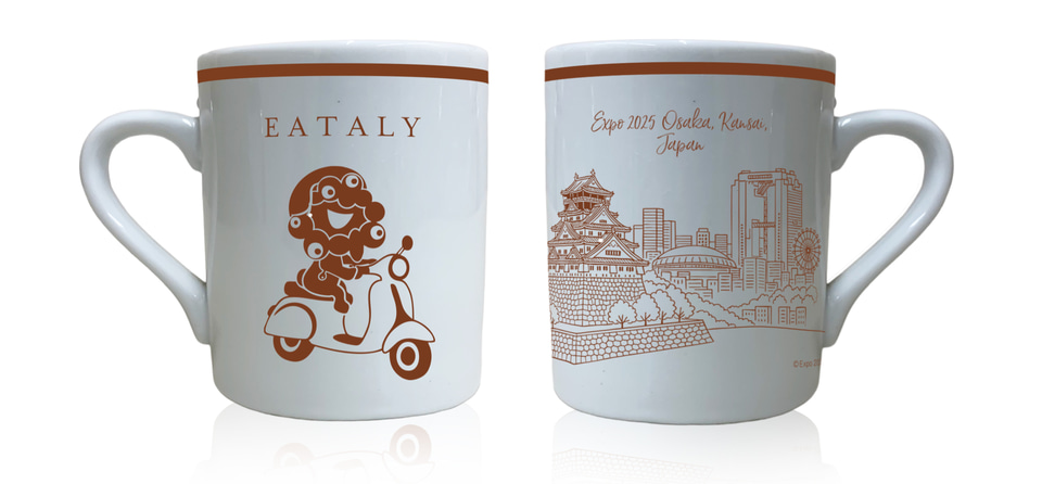 ラインアップは、ミャクミャクが大阪の街を散策する姿をイタリアらしい陽気な雰囲気で表現したトートバッグやマグカップなど4アイテム。楽しげにイタリアのスクーターに乗る赤と緑のミャクミャクは、イータリーの特別デザインとなっている。