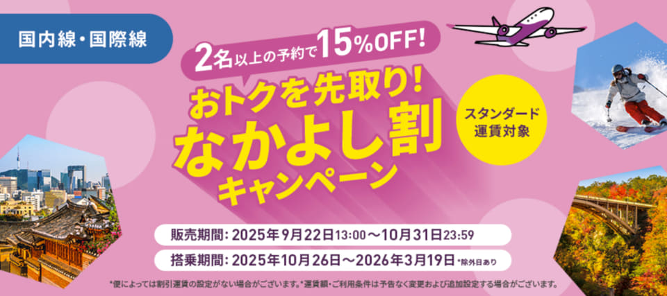 ピーチ(Peach Aviation)は、2名以上の予約で国内線・国際線の航空券が15%オフになる「なかよし割キャンペーン」を実施する。販売期間は9月22日13時~10月31日23時59分で、対象搭乗期間は10月26日~2026年3月19日(除外日あり)。