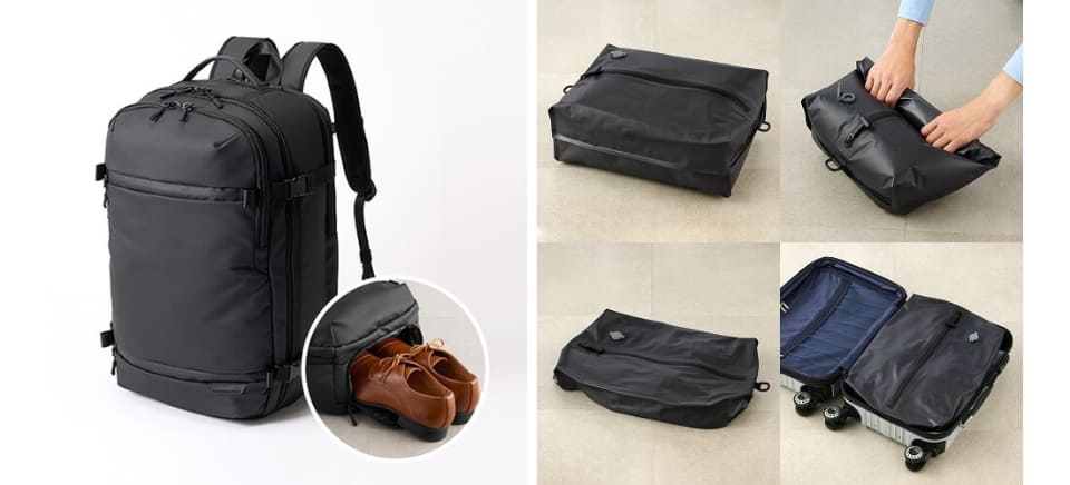 シューズ収納トラベルバックパックLは、仕事や日常で「もう1足靴を持ち運びたい」シーンに最適というバックパック。底面に靴が収まるサイズのポケットを備えており、ほかの荷物から独立して靴を収納できる。
