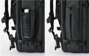 気室は、180度フルオープンで開くメイン気室の前後に、4つのポケットを装備した前気室とパソコン気室を設けた。前気室はガジェットなどの小物の整理に、パソコン気室は16インチまでのノートPCの持ち運びに活用できる。前気室に加え、前面、側面、背面にもポケットを配しており、貴重品や小物類、ペットボトルの収納に対応する。