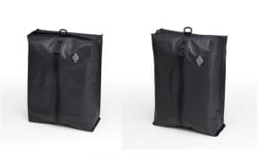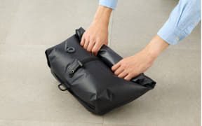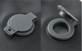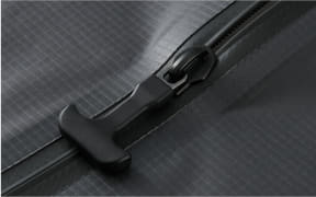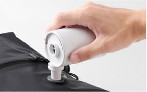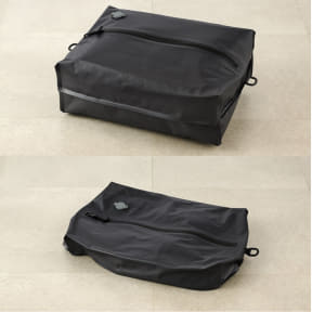 荷物を詰めたあとに、手で押すだけで空気が抜けて圧縮が完了する収納バッグ。空気の抜けるキャップは逆止弁付きで、しっかり圧縮できるほか、頑丈なファスナーを採用しているため空気漏れもしないという。市販の電動エアーポンプと組み合わせると、より薄く圧縮することができる。