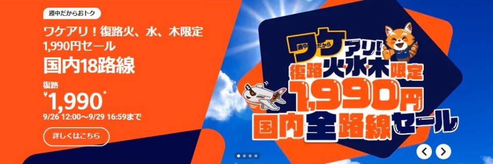 ジェットスター・ジャパンは、「ワケアリ!復路火、水、木限定1990円セール」を9月26日12時~29日16時59分に実施している。