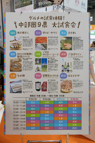 ブースですぐに目を引くのは乗り付けてあるフードトラックで、日替わり・時間帯別にご当地グルメの日替わり試食会を行なう。福井「焼き鯖すし」、石川「甘エビ・サワラ」、富山「ます寿し」、滋賀「四百年鮒寿し飯漬スライス」、岐阜「ご当地サイダー・コーラ」、長野「ご当地ワイン」、三重「なが餅」、愛知「発酵食みそだれ」、静岡「桜えびピザ」をそれぞれ用意しており、提供は先着順。