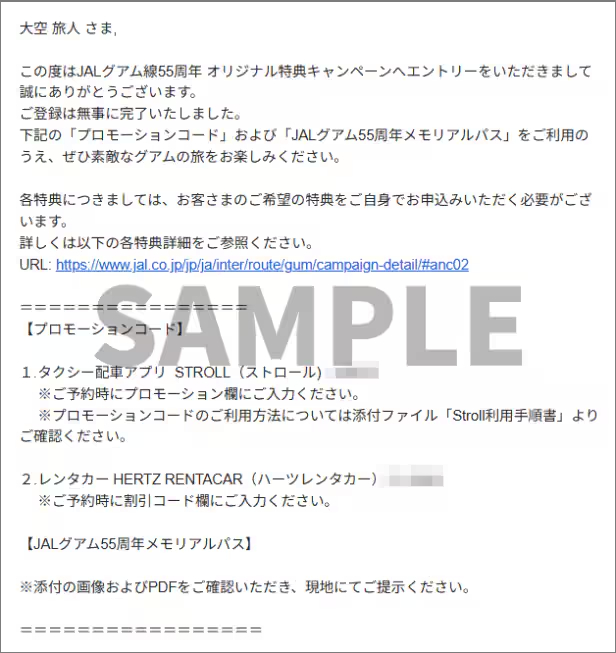 専用のGoogle フォームからエントリーした人に、グアムでの優待が受けられる「JALグアム線 アニバーサリーパス」および一部サービス用のクーポンコードをメールにて付与する。エントリー期間は9月25日~2026年9月25日で、成田~グアム線(JAL運航便)の予約番号または航空券番号とメールアドレスなどの入力が必要。