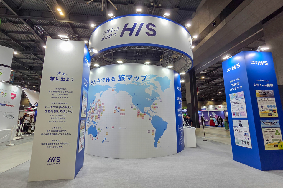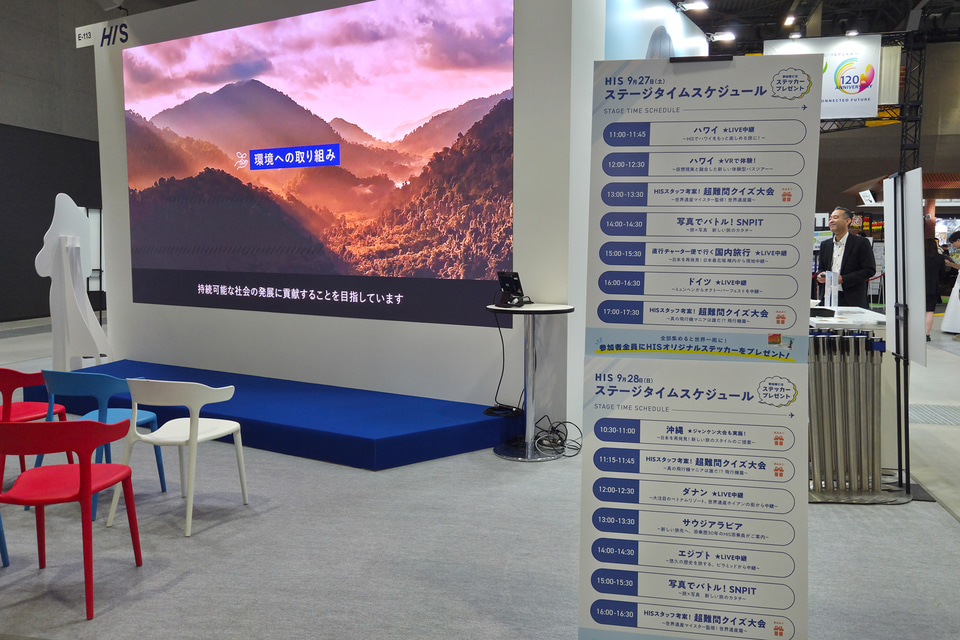 エイチ・アイ・エス(HIS)のブースでは、ステージで毎日2回にわたり、スタッフが考案したという「超難問クイズ大会」を実施。景品としてラグーナテンボスの入場券などを用意した。さらにハワイやドイツ、ダナン、エジプト、稚内とライブ中継も行なう。