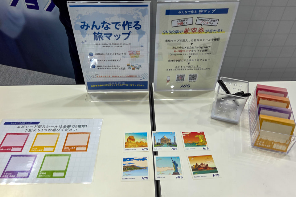 また、ブース内では「みんなで作る旅マップ」を実施。5種類のシールから1つ選んで旅の思い出を書き、ブースの世界地図に張りつけるもので、参加者にはオリジナルのステッカーを贈呈する。シールを撮影してSNSに投稿すると航空券が当たるキャンペーンも行なう。
