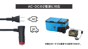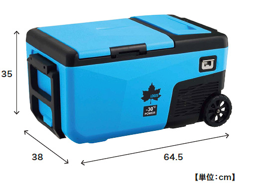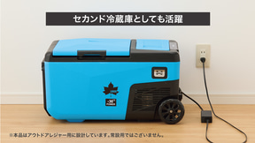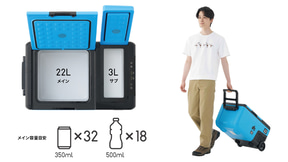 本体サイズは64.5×38×35cm(幅×奥行き×高さ)で、庫内に2つの荷室(約22L+約3L)を備える。電源はAC100V、DC12/24V(シガーソケット)。携行時に移動させやすい車輪を2つ装備している。