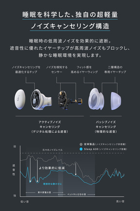 睡眠特化型の完全ワイヤレスイヤフォンとしては、世界で初めて適応型ノイズキャンセリング機能を搭載し、ユーザーの耳の形状や装着状態に合わせてノイキャン効果を自動で最適化するほか、付属の充電ケースが周囲のいびきを検知すると最適なマスキング音を自動生成して再生する機能も用意した。