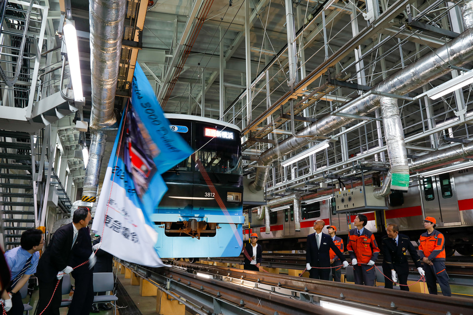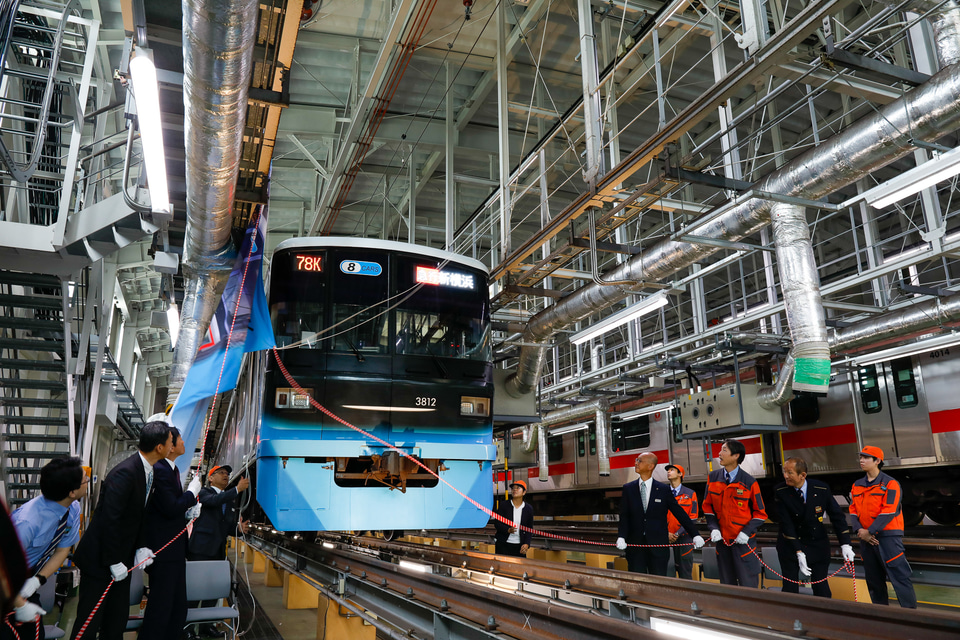 今回の報道公開は、検修庫におけるお披露目からスタートした。まず、東急電鉄 取締役 専務執行役員 鉄道事業本部長の伊藤篤志氏があいさつで登壇。そのあとで除幕式を行なって、ここで初めて現車が姿を現わした。