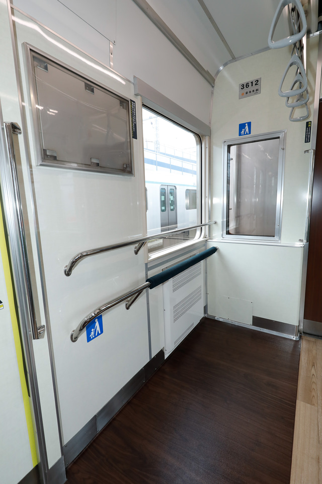 まず、2・3・6号車で車端部の腰掛のうち片側を撤去、フリースペース化した。また、既存のスペースについては手摺の増設(1段から2段に)を行なった。