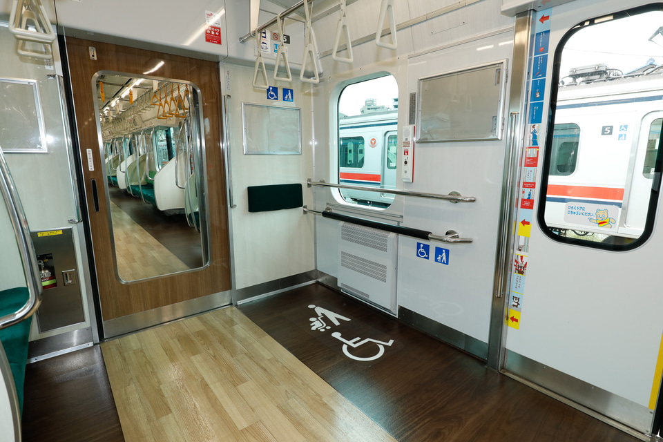 もともと、東急3000系では2号車の日吉寄りと7号車の目黒寄りに、暖房器、手すり、非常通報器を備えた車椅子スペースが設けられていた。そして今回のリニューアルで、フリースペースの増設が行なわれた。「各車両にフリースペース・車椅子スペースを設置する」というガイドラインに対応するためだ。