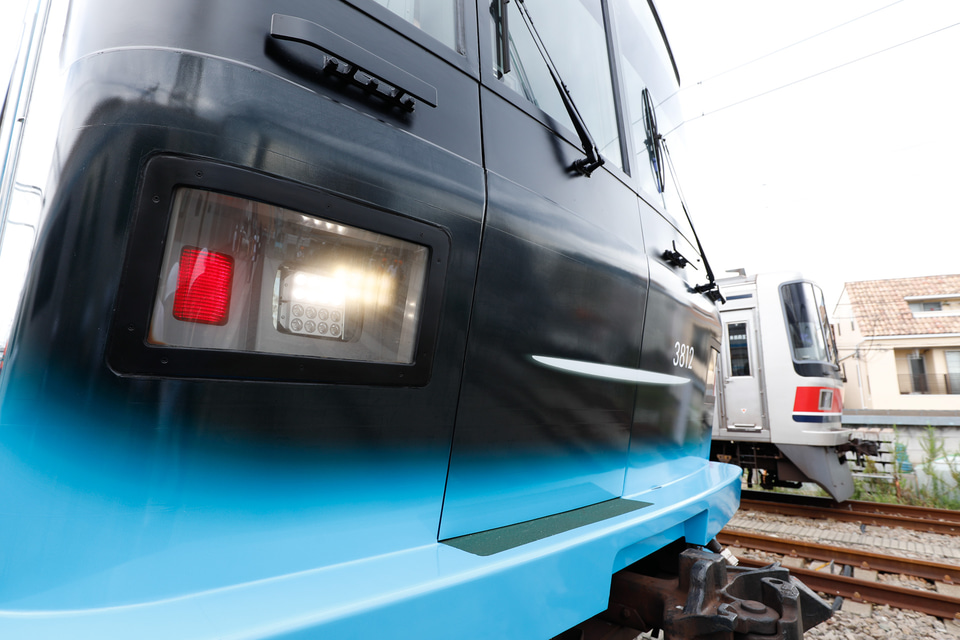 「街を表わす白に、ラインカラーの水色が溶け込んでいく」(嵯峨野氏)という狙いから、前面でグラデーションを取り入れた点が目を引く。ラッピングが広く使われるようになったからこそ、実現可能になったといえるだろう。塗装でグラデーションは、あまりやりたくない。