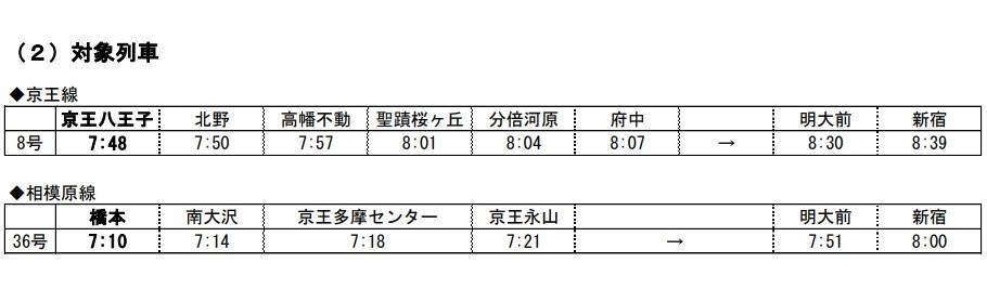 新宿行き上り列車「京王ライナー8号」(7時48分京王八王子発)と「京王ライナー36号」(7時10分橋本発)のどちらか一方を対象に、11月4日~28日の平日18日間にわたって同じ座席を一括予約できるフリーパスで、料金は1万800円。
