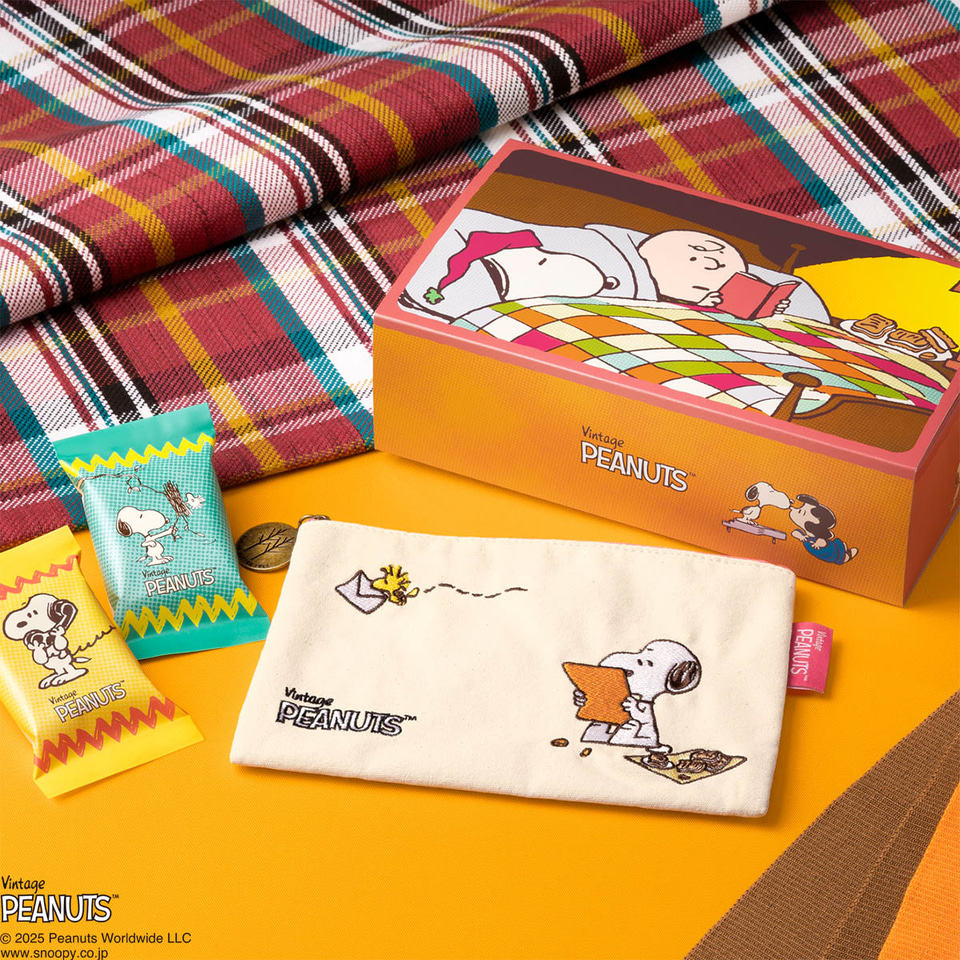 スヌーピーとウッドストックを刺繍でデザインしたポーチと、ポップアップ付きボックスがセットになった商品。チャーム部分にさりげないシュガーバターの木ロゴをあしらっている。