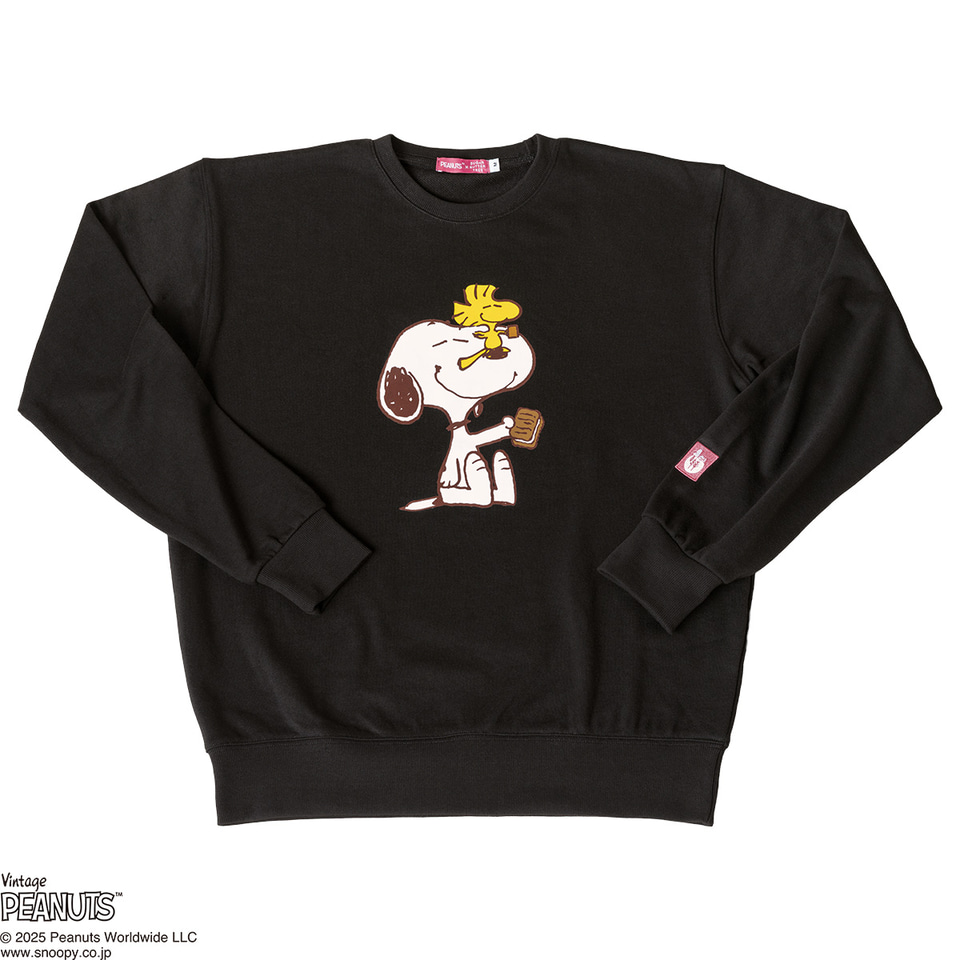 中央には「シュガーバターサンドの木」を持つスヌーピーを、袖にはワンポイント刺繍ロゴをあしらったオリジナルデザイン。