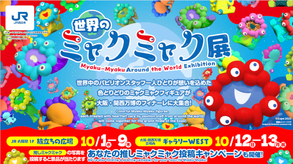 JR西日本は、大阪・関西万博フィナーレに向けた「世界のミャクミャク展」を明日から開催する。10月1日~9日はJR大阪駅 1階 旅立ちの広場で、10月12日~13日には万博会場内 ギャラリーWESTで行ない、いずれも事前予約不要。
