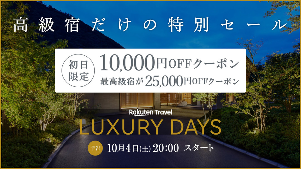 楽天トラベル、高級宿セール「LUXURY DAYS」10月4日開始。初日1時間限定の2万5000円引きクーポン配布中
