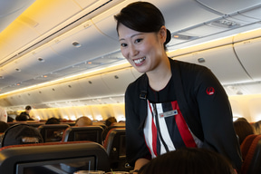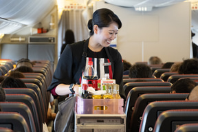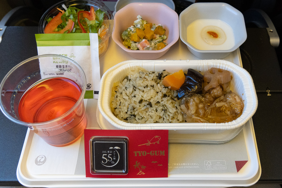 繰り返しになるが、JALグアム線の機材はボーイング 767-300ER型機。「JAL SKY SUITE II」仕様のビジネスクラス24席と、シートピッチ約84~86cmの「JAL SKY WIDER」仕様のエコノミークラス175席の2クラス制で(計199席)、今回、この記念日の往路便に搭乗する機会を得た。