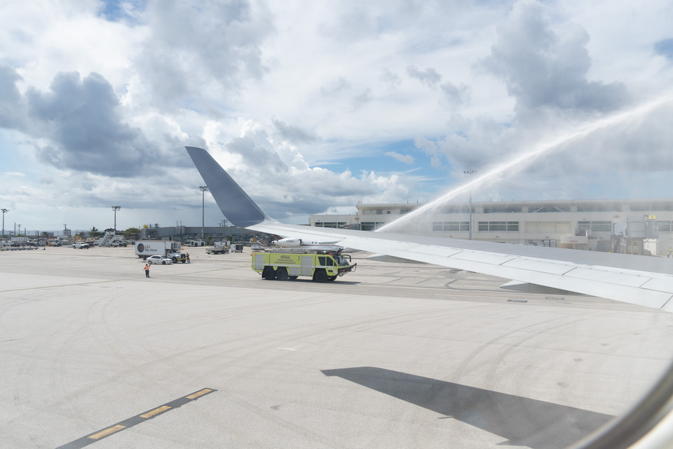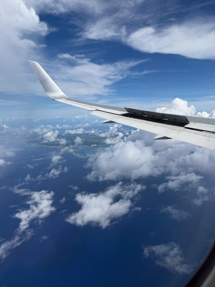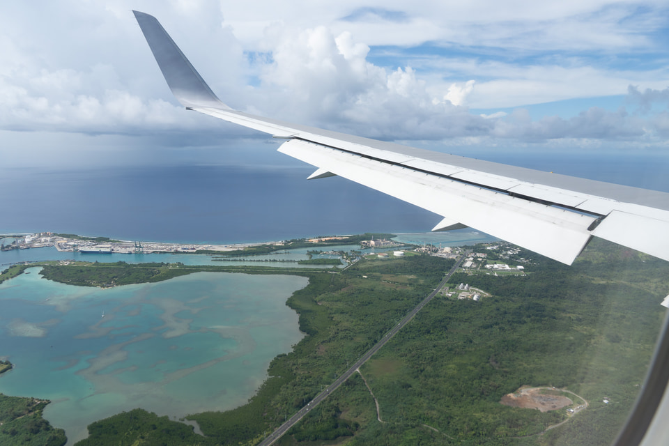 グアムは“もっとも近い海外リゾート”と呼ばれるように、成田発のフライトは定刻で3時間45分(この日は3時間36分だった)と短め。離陸してベルトサインが消えて、機内食が提供されて食後にコーヒーを飲んで……と過ごしていると、気付けば機体が降下をはじめている、という距離感なので、体調的に長距離のフライトは辛いとか、小さな子供連れでまわりに気を使ってしまうといった旅行者にぴったりだ。体感的には羽田~石垣島(約3時間)と大差ない。