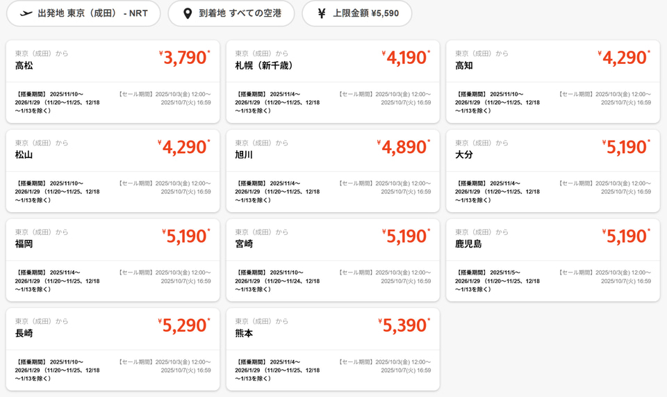 座席数・曜日限定で、11月~2026年1月搭乗分が対象(路線によって設定期間が異なる)。エコノミークラス「Starter」の航空券を片道3790円~で販売する。支払手数料、空港使用料、受託手荷物料金などは別途必要。