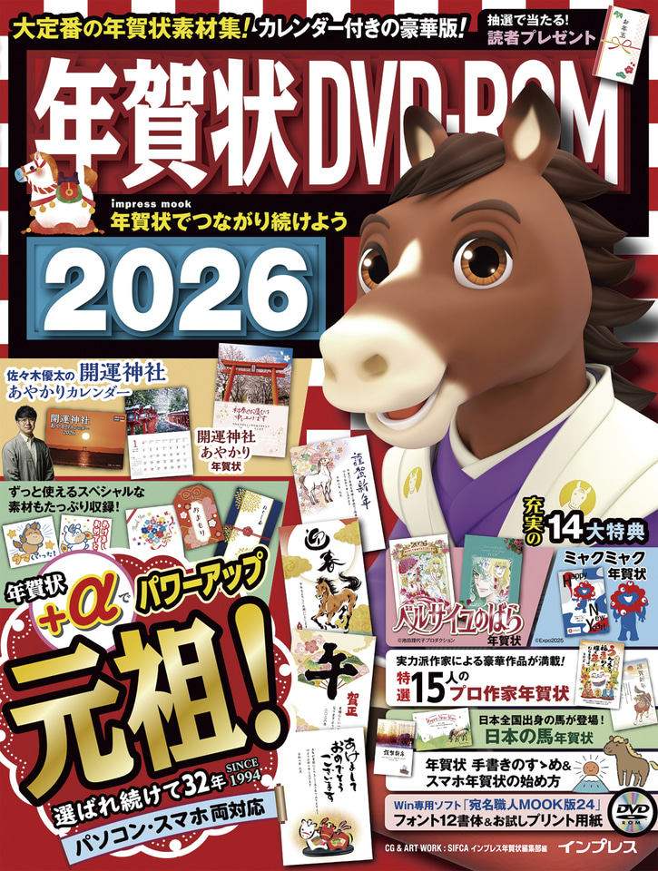 インプレスは、ムック「年賀状DVD-ROM 2026」を10月7日に発売する。A4変形判・256ページで、価格は1870円。