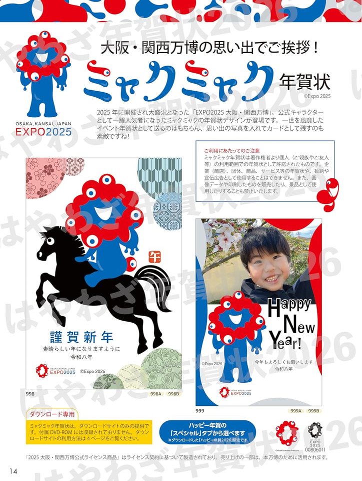 そのほか「はやわざ年賀状2026」「写真で年賀状&オリジナルグッズをつくろう ふぉとねんが 2026」にも、それぞれ異なるデザインの「ミャクミャク年賀状」を収録している。