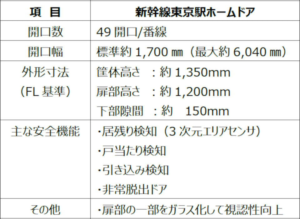 今回導入するのはドア位置の異なる多くの編成に対応し、該当するホームドアを自動で開扉する新しい方式で、新幹線では世界初。利用客と列車との接触や線路への転落防止対策として設置する。使用開始時期は、20番線・21番線の各ホームが2028年度末、22番線・23番線の各ホームが2029年度末を予定。