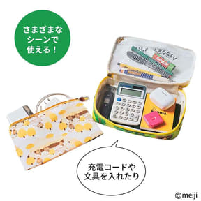 ころんとかわいいチャームは傘やペットボトルなど持ち物の目印として、ポーチはお菓子やガジェット、メイク道具入れとして、マルチに使える。