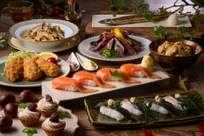 11月30日までは秋フェアメニューも提供。秋刀魚握りやかつおたたたき、松茸ごはん、朝食には炭火でじっくり焼き上げた秋刀魚一本焼きを用意する。
