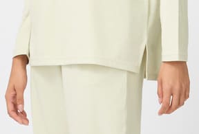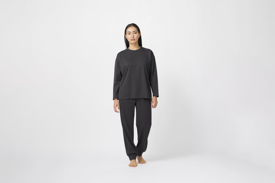 長袖Tシャツとロングパンツを展開し、価格は各2999円。カラーはアイボリーとチャコールグレーの2色をラインアップする。