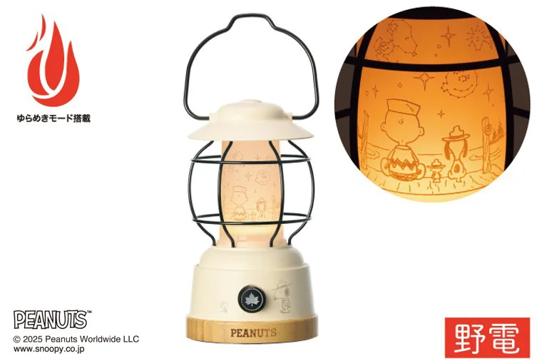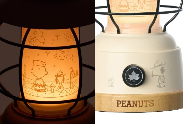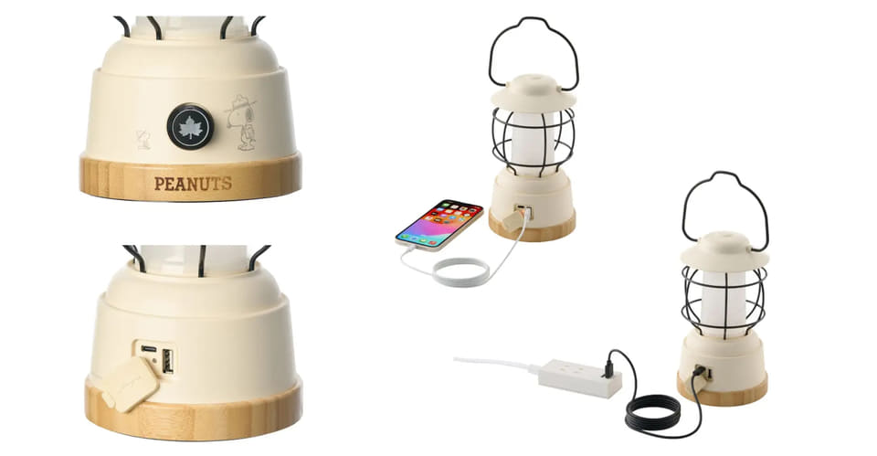 スヌーピーたちがアウトドアを楽しむ様子を描いた「CAMP with SNOOPY」シリーズ商品として登場した、バッテリー式のランタン。電池や火気を用意せず使用でき、スマートフォンなどを充電できる出力ポートも備えている。