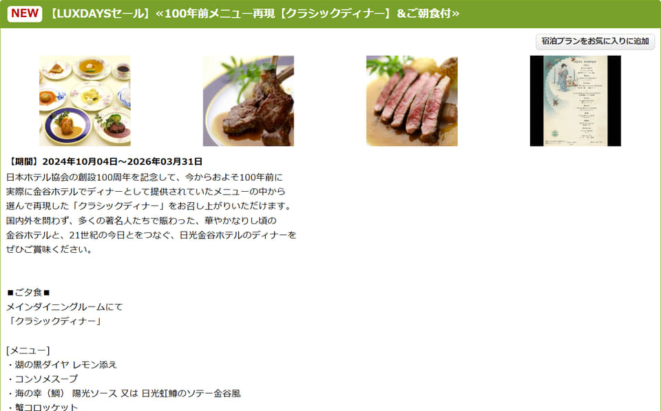現存する日本最古のリゾートホテル「日光金谷ホテル」(栃木県日光市上鉢石町1300)では、100年前のメニューを再現したクラシックディナー&朝食付きプランを販売中(2026年3月31日宿泊分まで)。2名1室利用1人あたりの価格は、本館デラックスタイプ-ツイン-の場合4万6692円~。