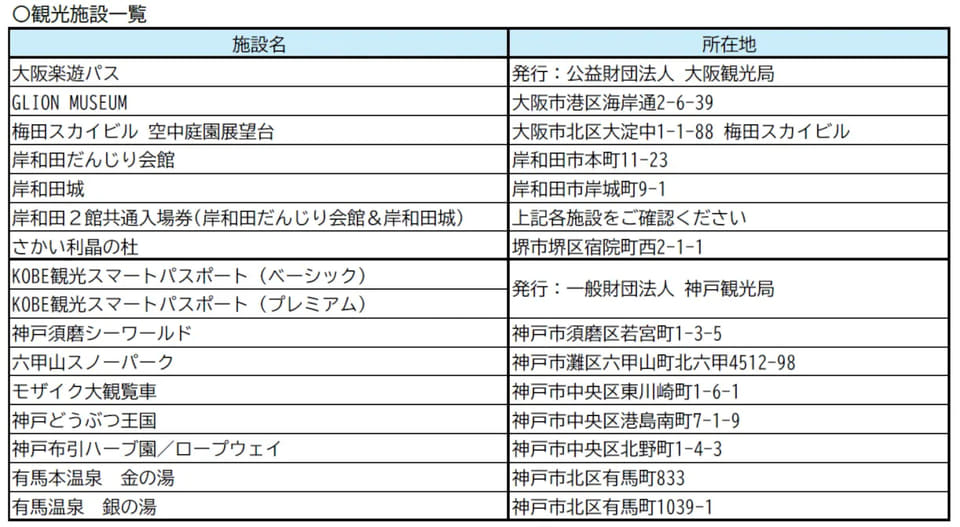 セット購入の対象観光施設入館券は計16種。梅田スカイビル 空中庭園展望や神戸須磨シーワールド、神戸どうぶつ王国といった施設のほかに、観光スポット25か所以上がQRコード1つで入場無料になる「大阪遊楽パス」や神戸市内の観光施設が巡り放題の「KOBE観光スマートパスポート」なども対象になっている。