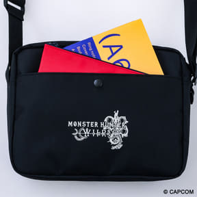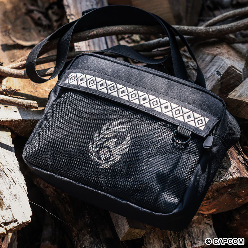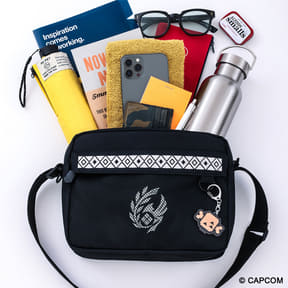 ファミマ限定「モンスターハンターワイルズ」調査隊エンブレム入りショルダーバッグ。多ポケット&Dカン付き