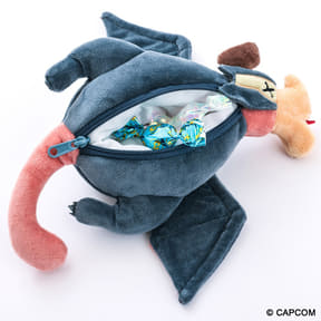 ポーチは今作で復活を遂げたモンスター“ゲリョス”がモチーフ。“死んだふり”で相手との戦闘をやり過ごそうとする姿をコミカルに再現している。サイズは全長約27cm。お腹のファスナーを開けると小物が入れられ、キーホルダーとしてバッグに付けたり、ぬい活したりと楽しめる。