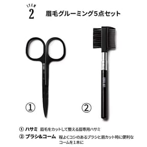 美眉をつくるのに欠かせない厳選アイテムたちは、ハサミ、ブラシ&コーム、毛抜き、スクリューブラシ&平筆がラインアップ。シックな黒にロゴをあしらった統一感もポイントになっている。