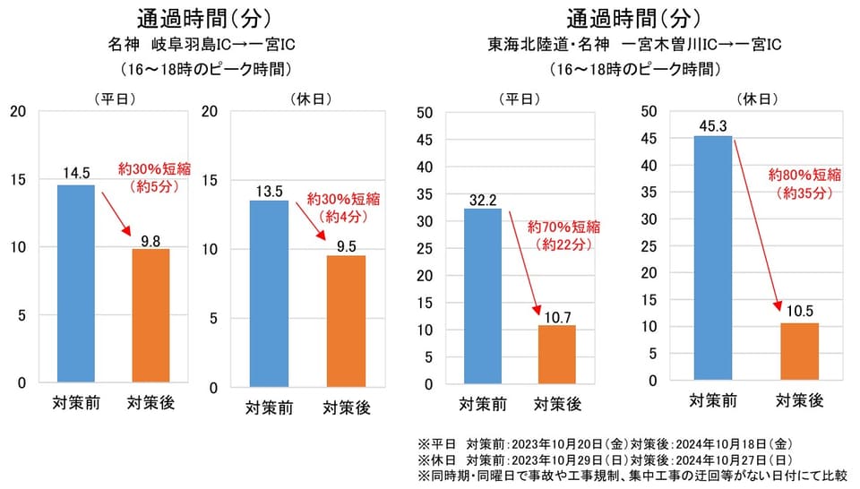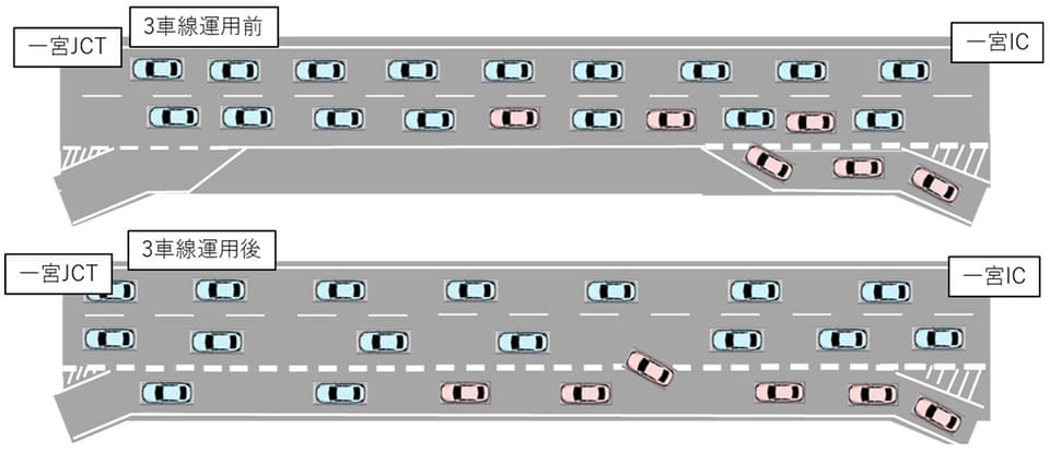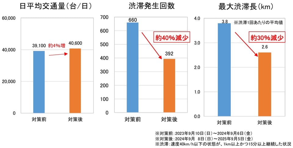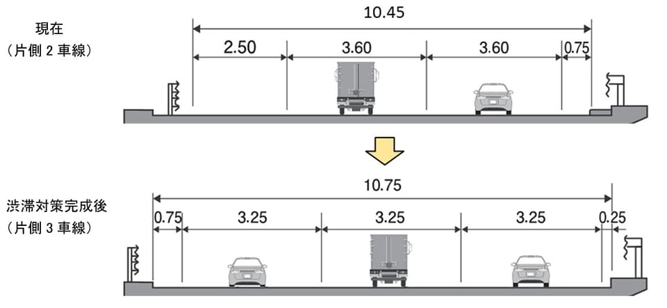 通勤時間帯などに発生する激しい渋滞への対策として、2024年9月に上り線を片側3車線化。今回の工事で下り線も片側3車線化し、6車線化が完成する。先行して3車線化した上り線では渋滞発生回数が約40%減少、最大渋滞長が30%減少したという。