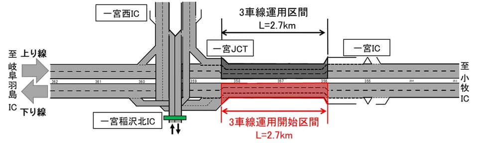 NEXCO中日本 名古屋支社は、11月8日~29日に予定する名神集中工事の終了をもって、一宮IC~一宮JCT間の6車線運用を開始する。正式な運用開始日は11月下旬をめどとし、後日発表予定。