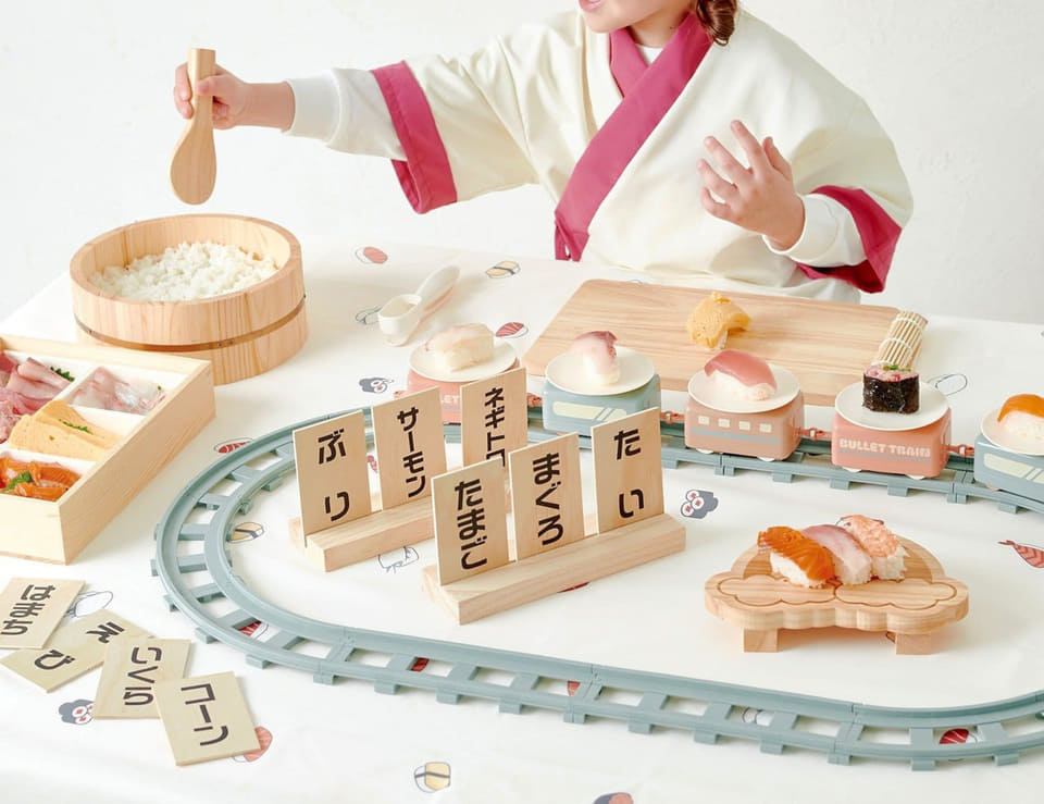 ラインアップは、「ミニしゃもじ&ミニまきすセット」(330円)、「ミニ寿司桶」(880円)、「寿司下駄」(770円)など。また、型にごはんをギュッとつめてレバーを押すだけでポンッと簡単にしゃりが完成する「しゃりメーカー」(330円)や、お寿司が電車にのってレールの上を走るまるで回転寿司の「おすしトレイン」(3850円)も新登場する。