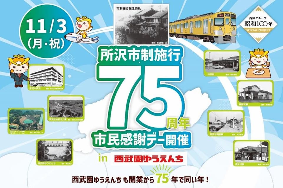 西武園ゆうえんち(埼玉県所沢市山口2964)は、11月3日に「所沢市民感謝デー」を所沢市・西武鉄道と共催する。同日は所沢市の市制施行75周年となることから、「75」に関連した企画を行なう。