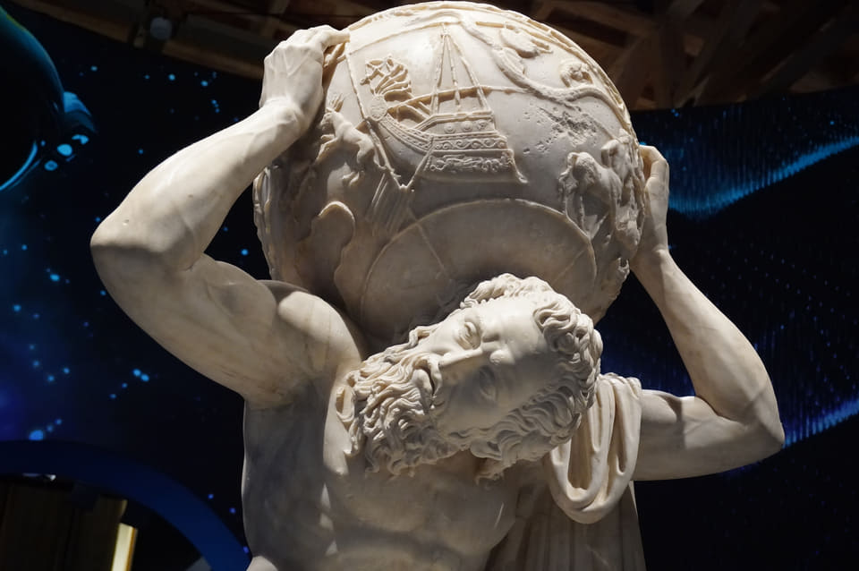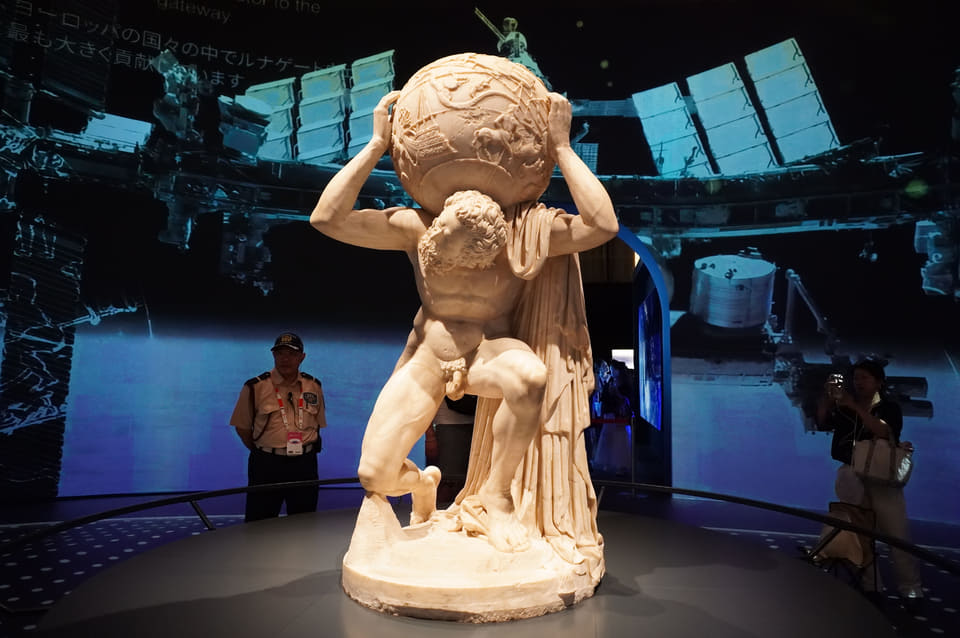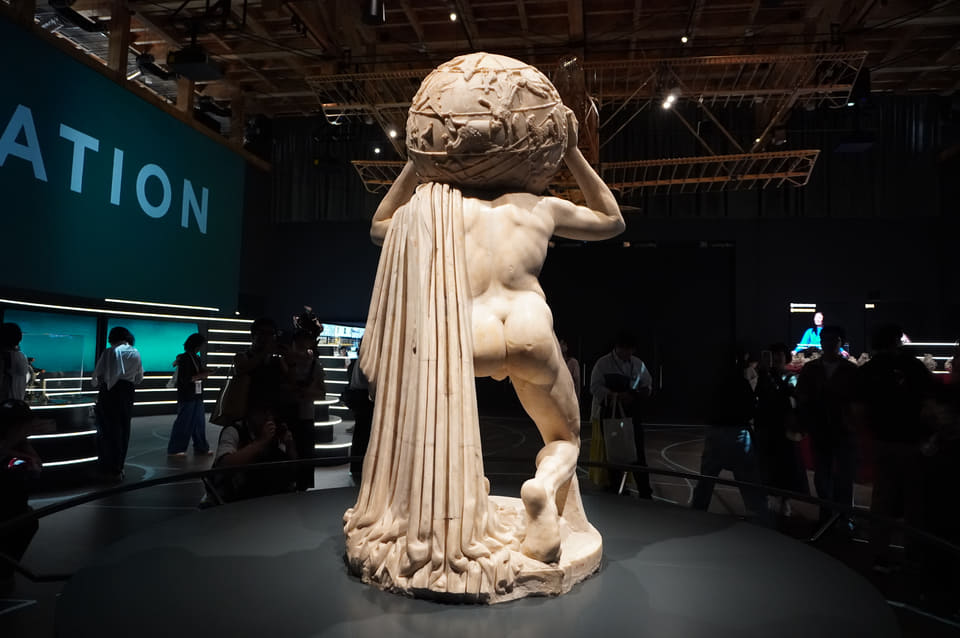 館内中央の広場「ピアッツァ」に展示されたのは、2世紀に作られた大理石像《ファルネーゼのアトラス》。巨人アトラスが天球を背負う姿を表した作品で、通常はナポリ国立考古学博物館にある。この万博で日本初公開となり、実物が大阪に運ばれたこと自体が開幕前から大きな話題を呼んだ。