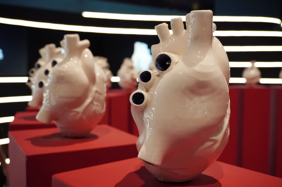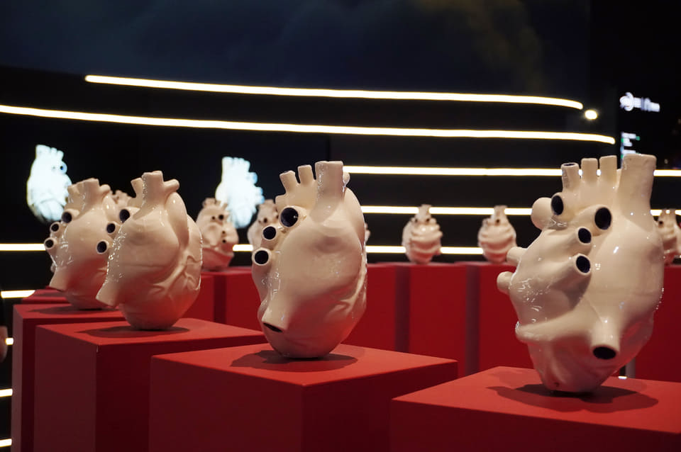 30個の心臓が並ぶ彫刻インスタレーション